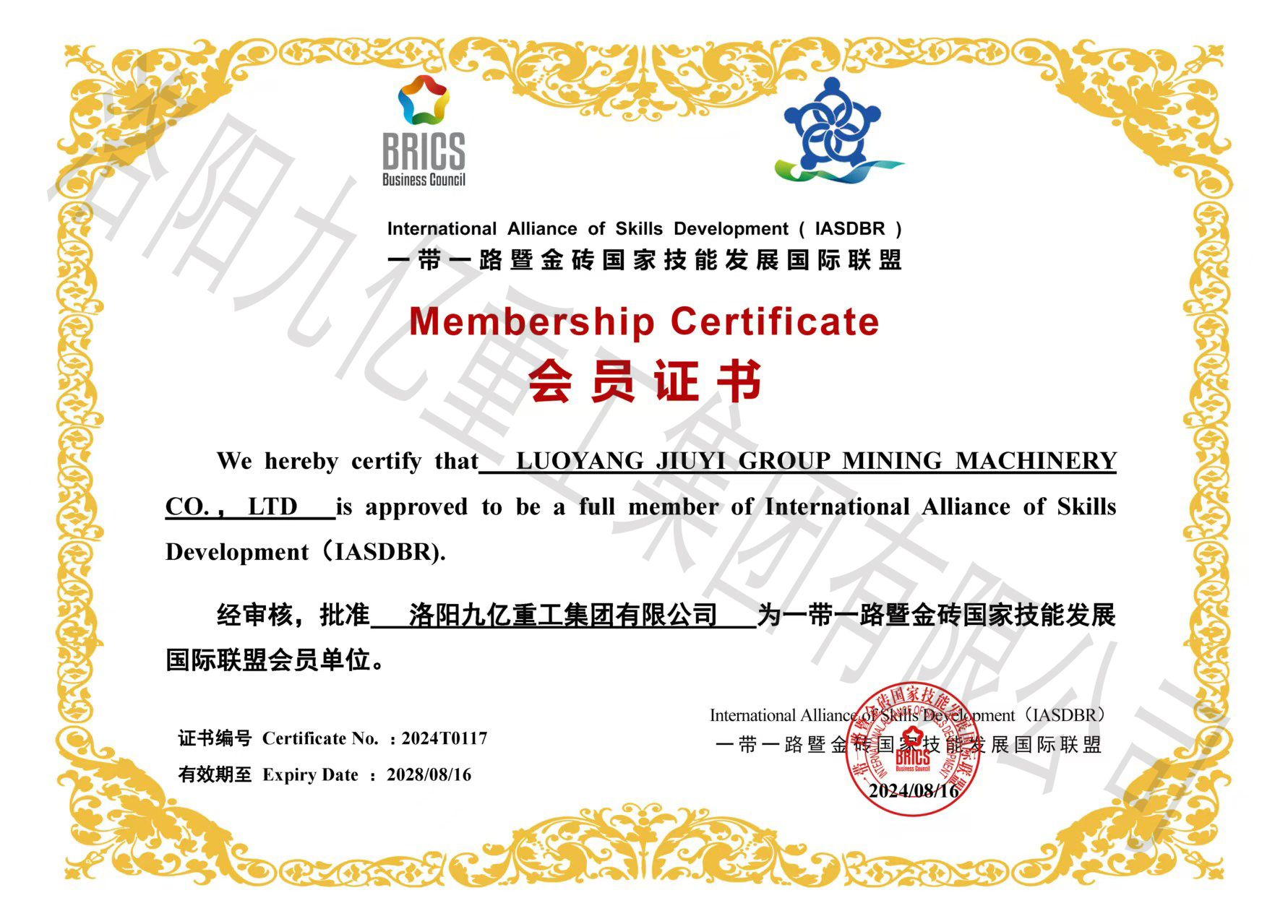 一帶一路暨金磚國家技能發(fā)展國際聯(lián)盟會員證書